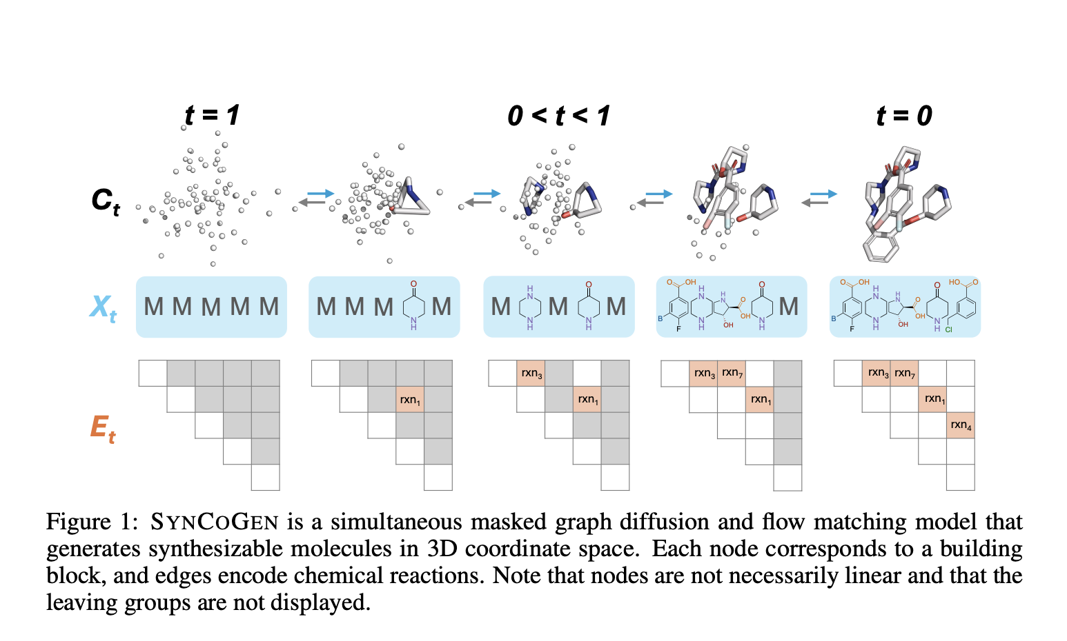 • Multimodal Generation: By blending masked graph diffusion (for reaction graphs) with flow matching (for atomic coordinates), SYNCOGEN samples from the joint distribution of building blocks, chemical reactions, and 3D structures.
